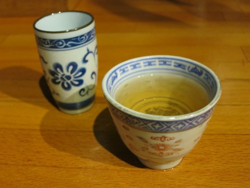 After properly heating all of the porcelain cups, the brew kettle, and the tea-pot with hot water, brewing the tea, and then serving, you’ll finally be able to enjoy the end product. The tall, skinny cup on the left is meant for enjoying the tea’s aroma, while the larger, wider one on the right is the one from which you actually drink