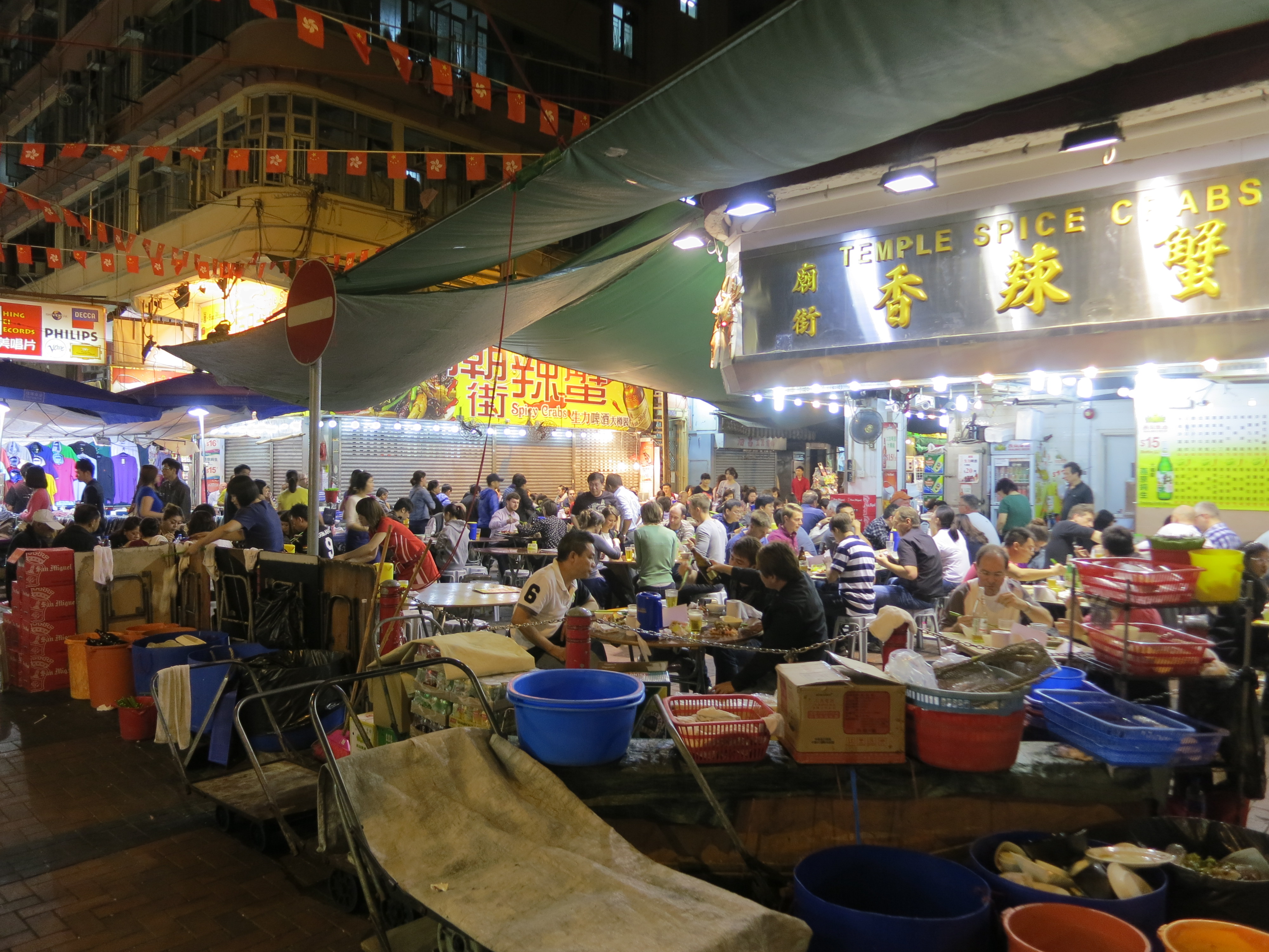Diners enjoying the festive atmosphere and tasty treats near a street market in Kowloon