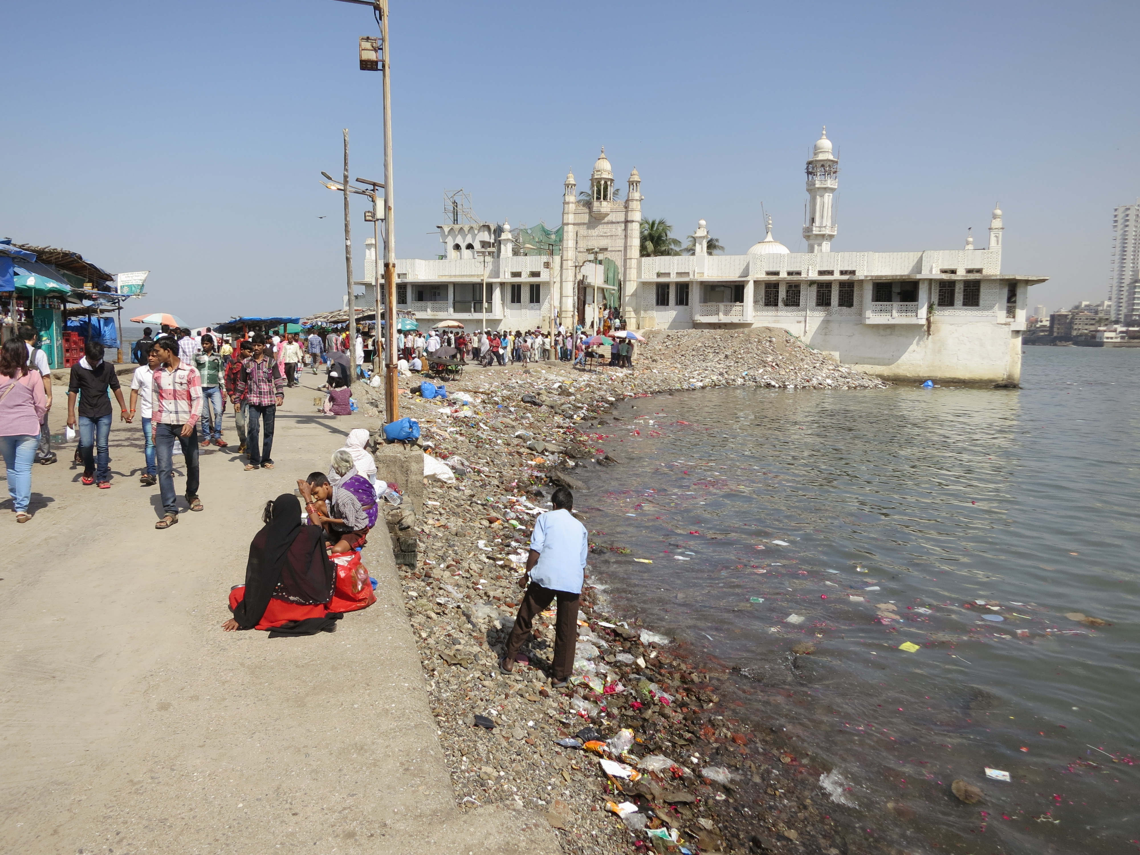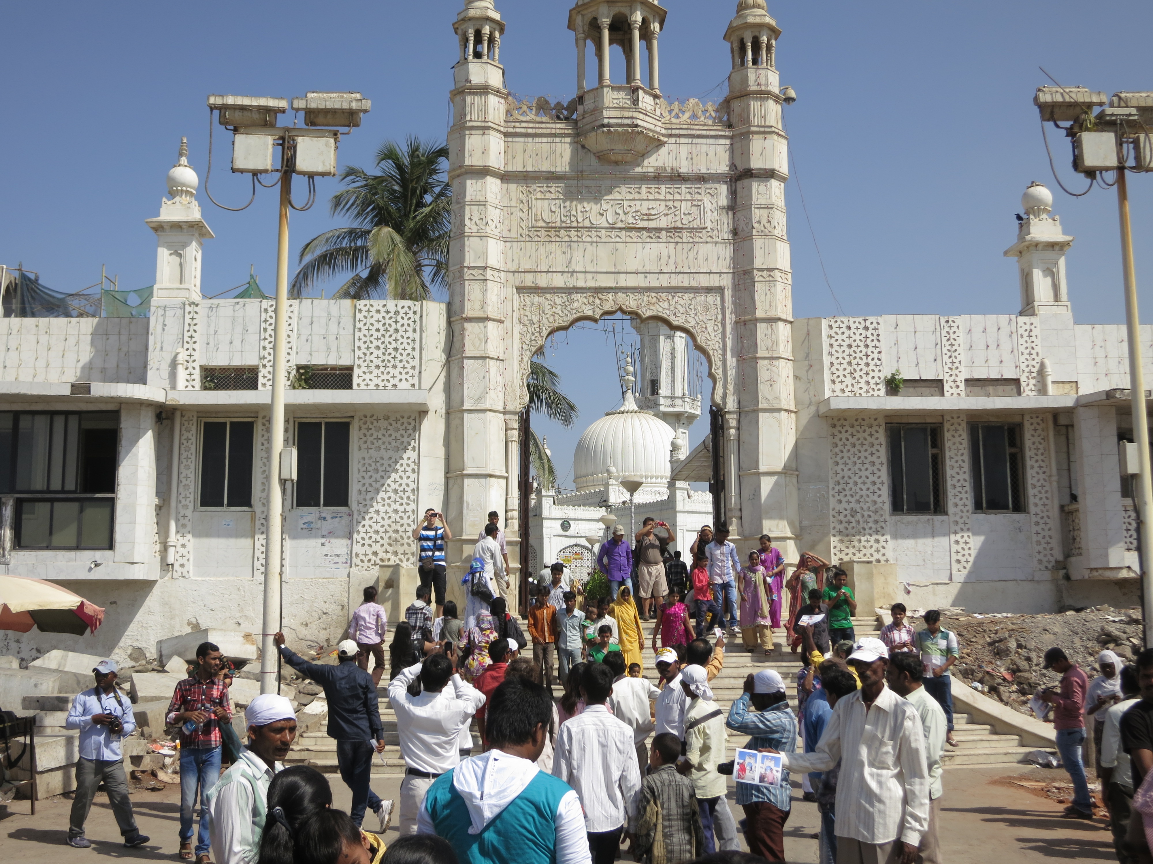 One of the most unusual and striking sights in the city of Mumbai is that of the Haji Ali Mosque — housing the tomb of the Muslim Saint Haji — which is built atop a small island set out in the water to the West of the city. A long causeway bridge allows access to the Mosque, but only during low tide, as the high tide will completely cover the causeway, leaving the Mosque to seemingly drift away on its own isolated island. Further, it has become a common tradition for pilgrims coming to visit the mosque to donate money to the many beggars who line the path over the water.