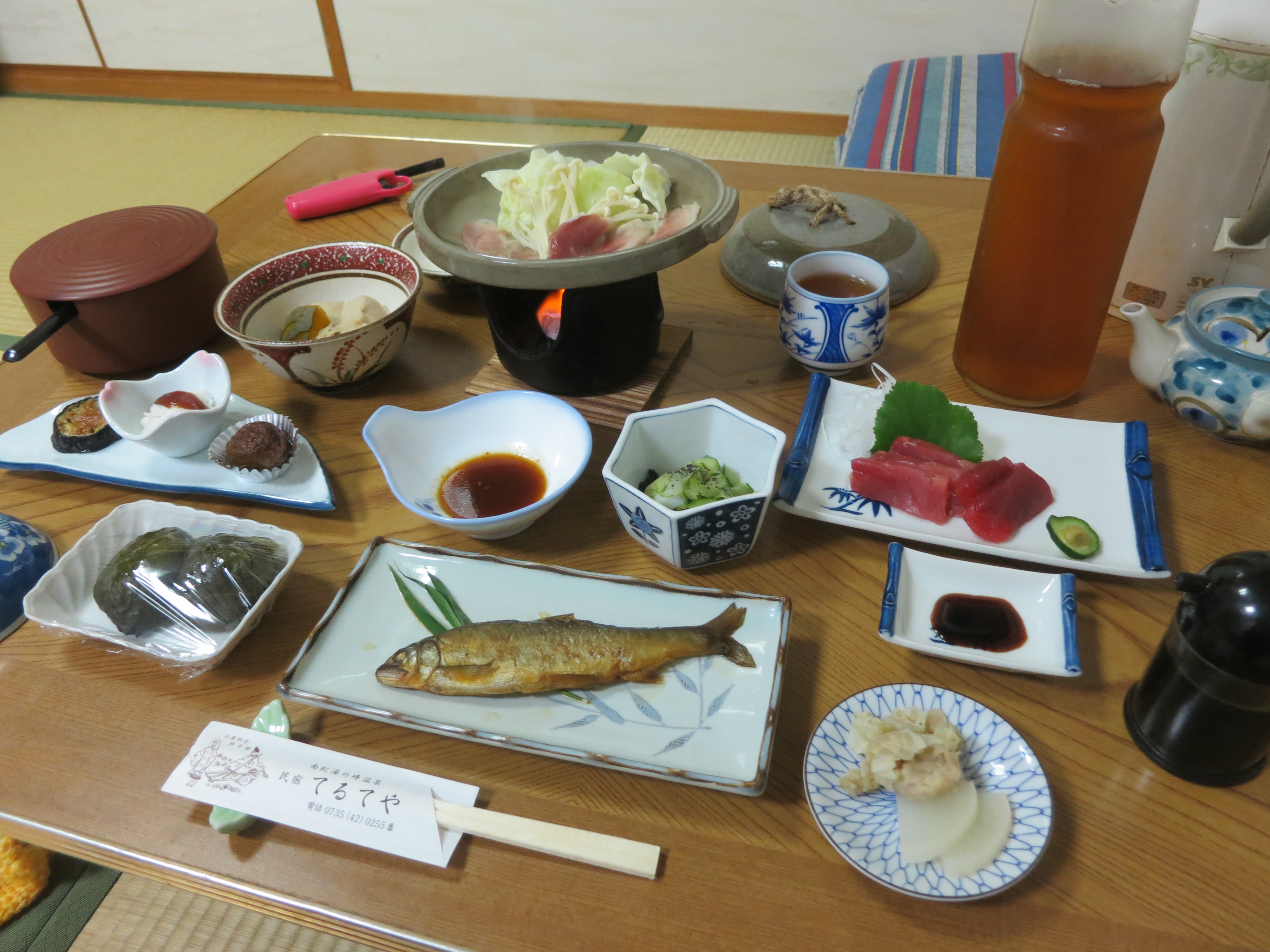 After having soaked away all of your cares in your Minshuku’s bath or Onsen, it’s time to don a yukata (thin, pajama-like kimono) and sit down to dinner for the night, which is also provided as part of your stay.  These mountain lodges don’t offer your average everyday fare, however; instead, they prepare elaborate feasts that roughly follow along the guidelines of a kaiseki meal (again, see my previous Kyoto post here for a kaiseki primer) — although some do choose to serve all of the evening’s dish at one time as opposed to a series of individual courses served over an hour or two.  In fact, it is largely the cuisine the distinguishes one Minshuku from an another, and why visitors many may seek out one particular location over another (much like with the ryokan in other parts of Japan).  Here is an example of a semi-kaiseki meal that I was served after my first day on the trail: