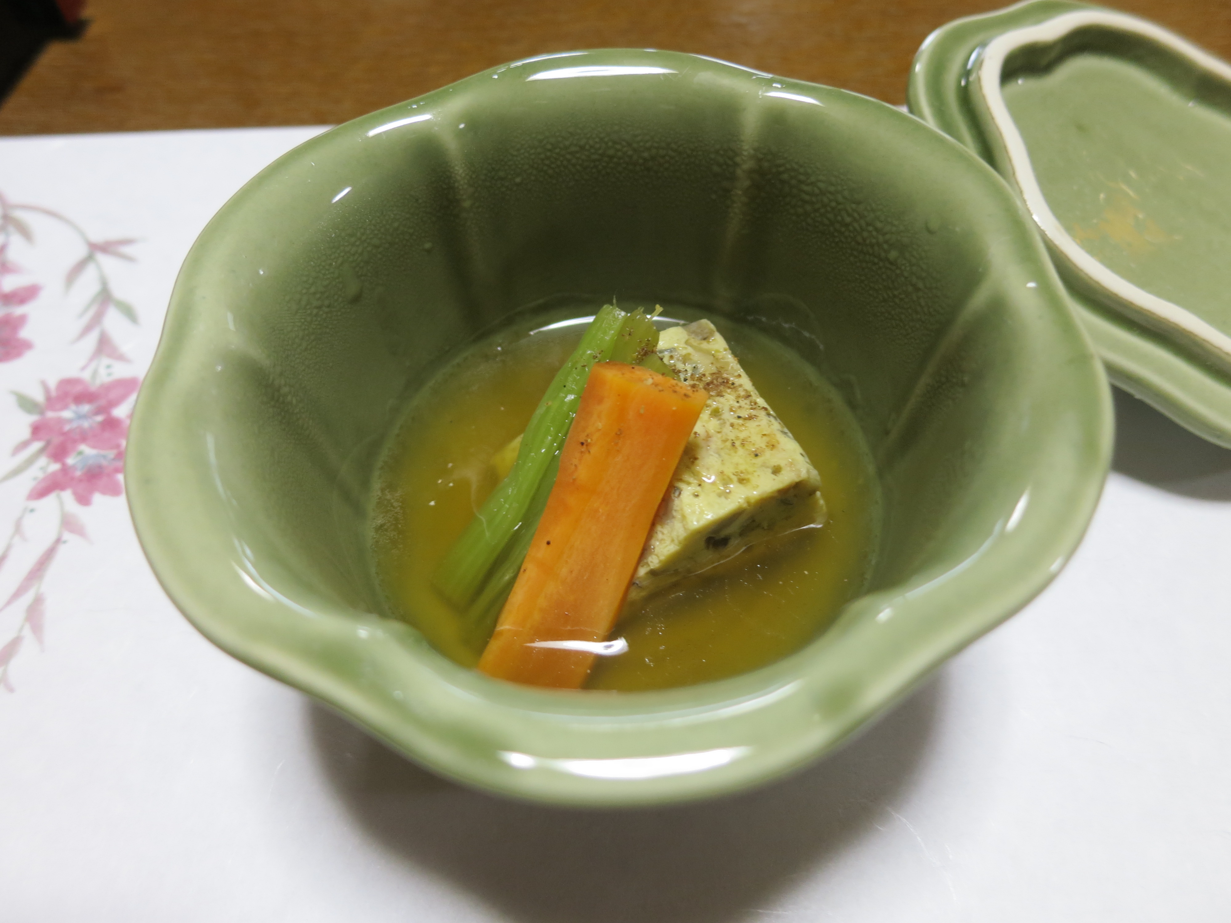 Tempura Vegetables with Green Tea Salt (on the left) and a cold dish of lightly cooked fish with apples (on the right)