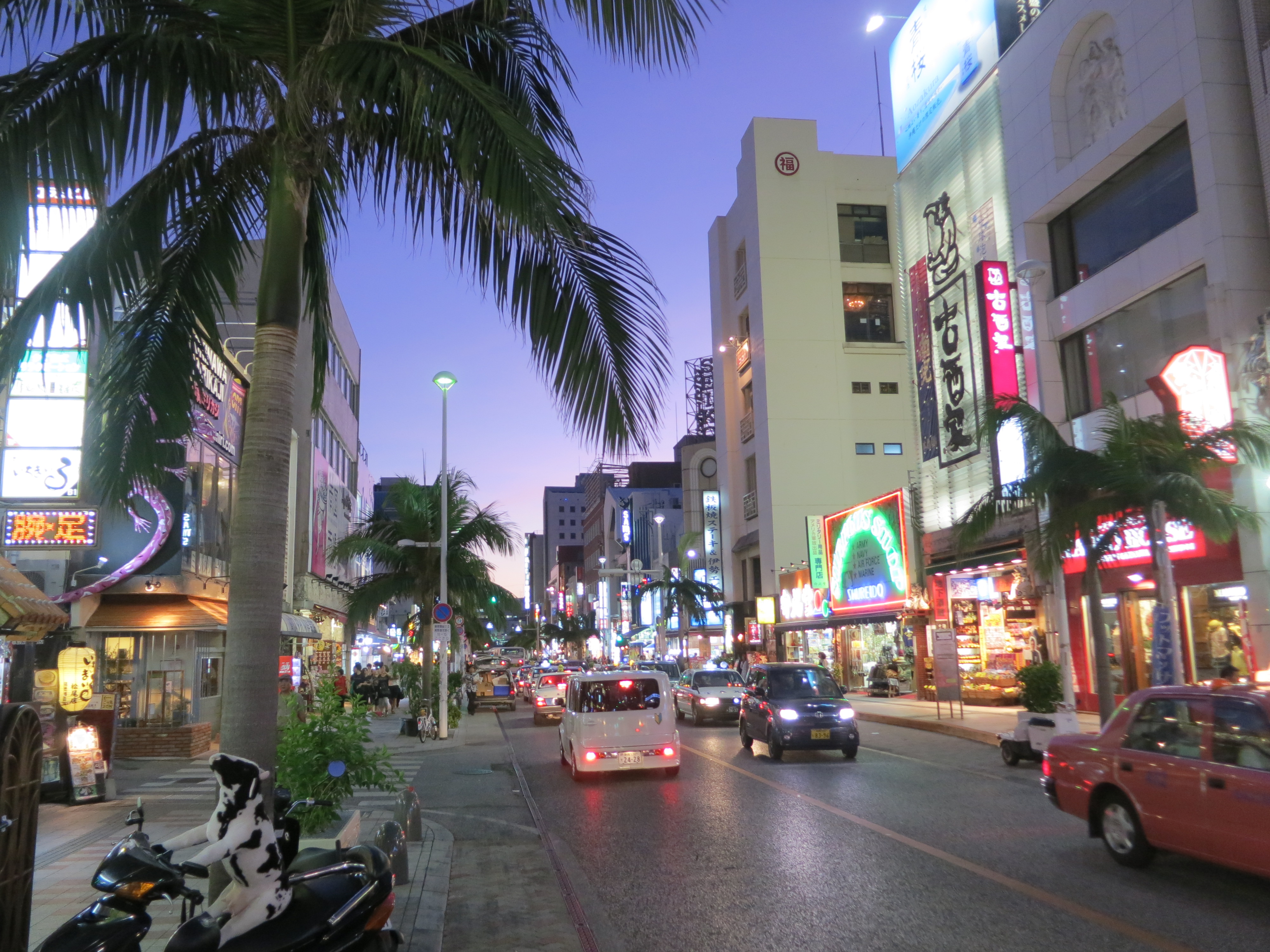 The city's main street and commercial hub, Kokusai-dori, is awash in neon lights and kitschy flair come sunset