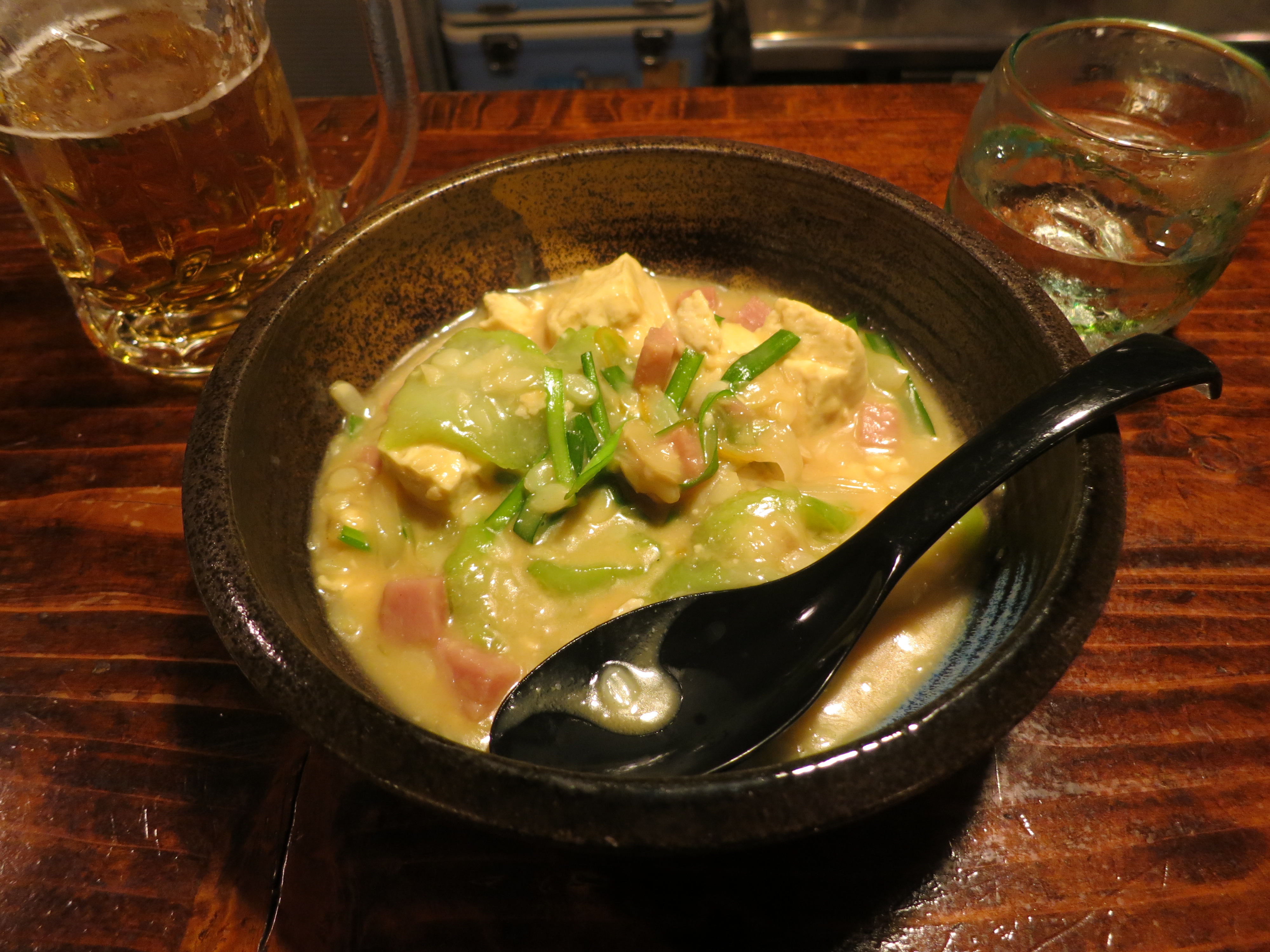 A stew utilizing Na-bera, a less-common vegetable otherwise known as “Spongy Gourd,” or so I’m told. And those little pink bits floating around in there? Oh yeah, those are hunks of span – I told you they actually eat that stuff here!