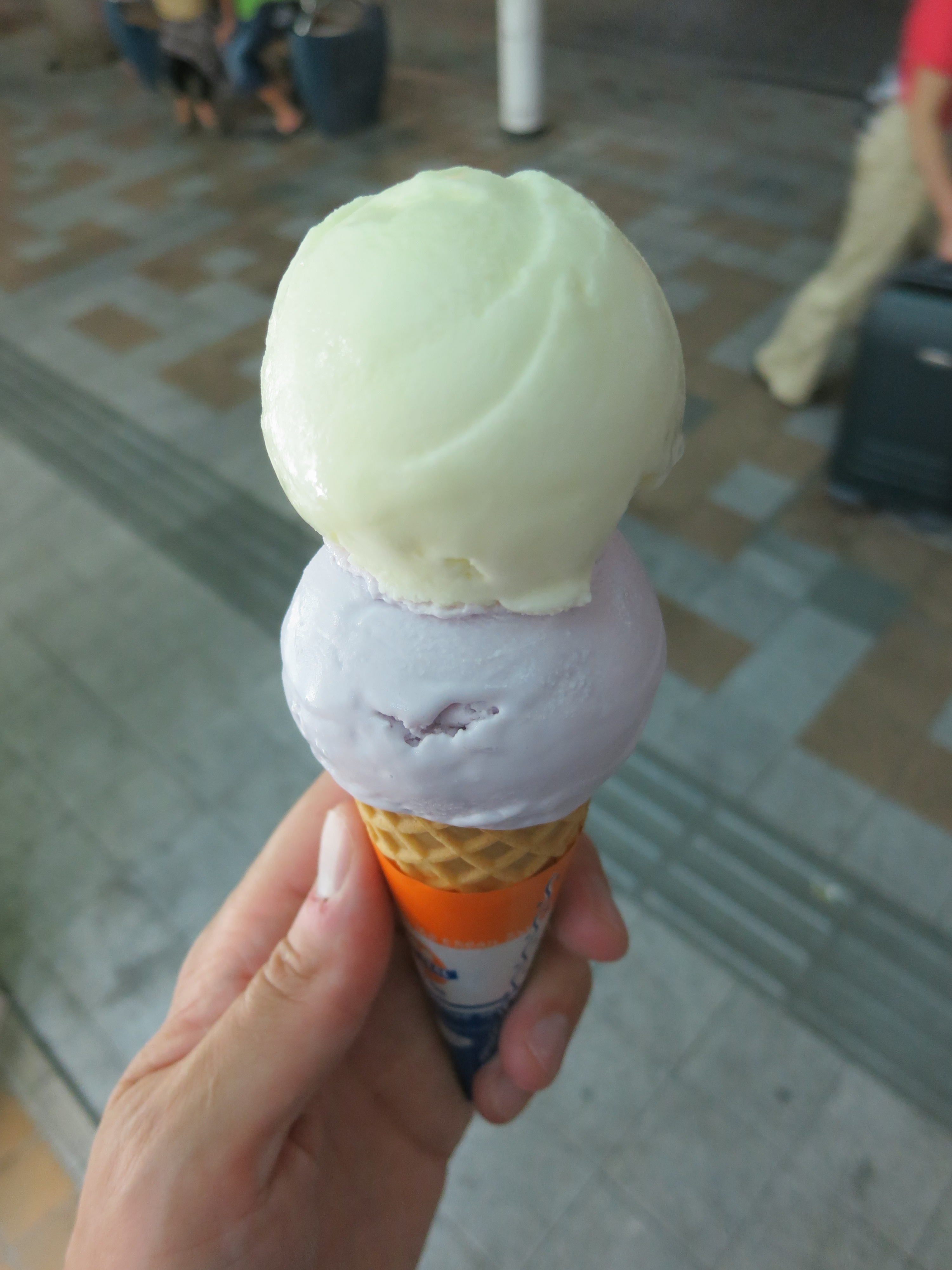 And lastly, I couldn’t validly say I visited Okinawa without trying its famous “Blue Seal” Brand ice cream. This American-borne ice cream maker has uniquely adopted island ingredients for its flavors: seen here is a scoop of Shiiquasa (a local citrus fruit) on top of a scoop of Beni-imo, a type of purple sweet potato.  Tasty!