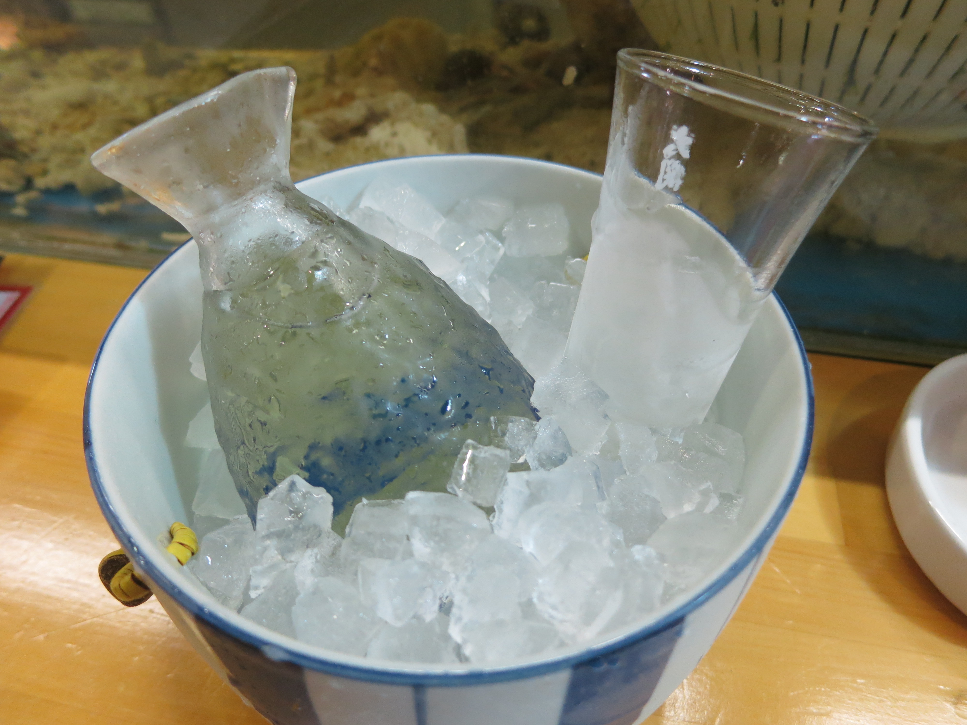 A traditional pottery serving vessel for Awamori (incidentally, Okinawa is also famous for its pottery). Due to its lethal alcohol content, Awamori is usually served with a bucket of ice and a glass of water for dilution, as seen above