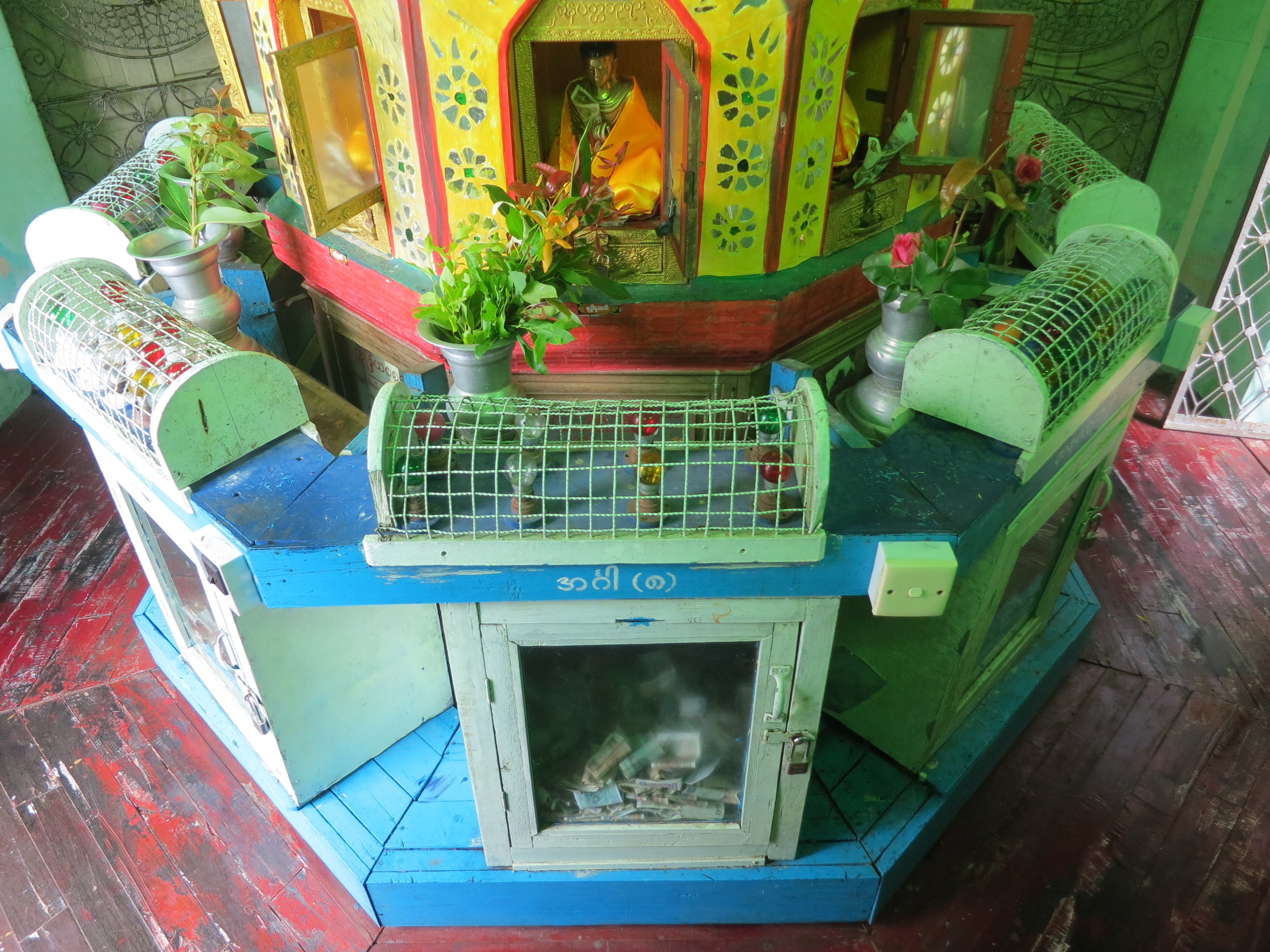 A small but colorful Buddha image, set amidst a column full of small alcoves, each with its own Buddha image