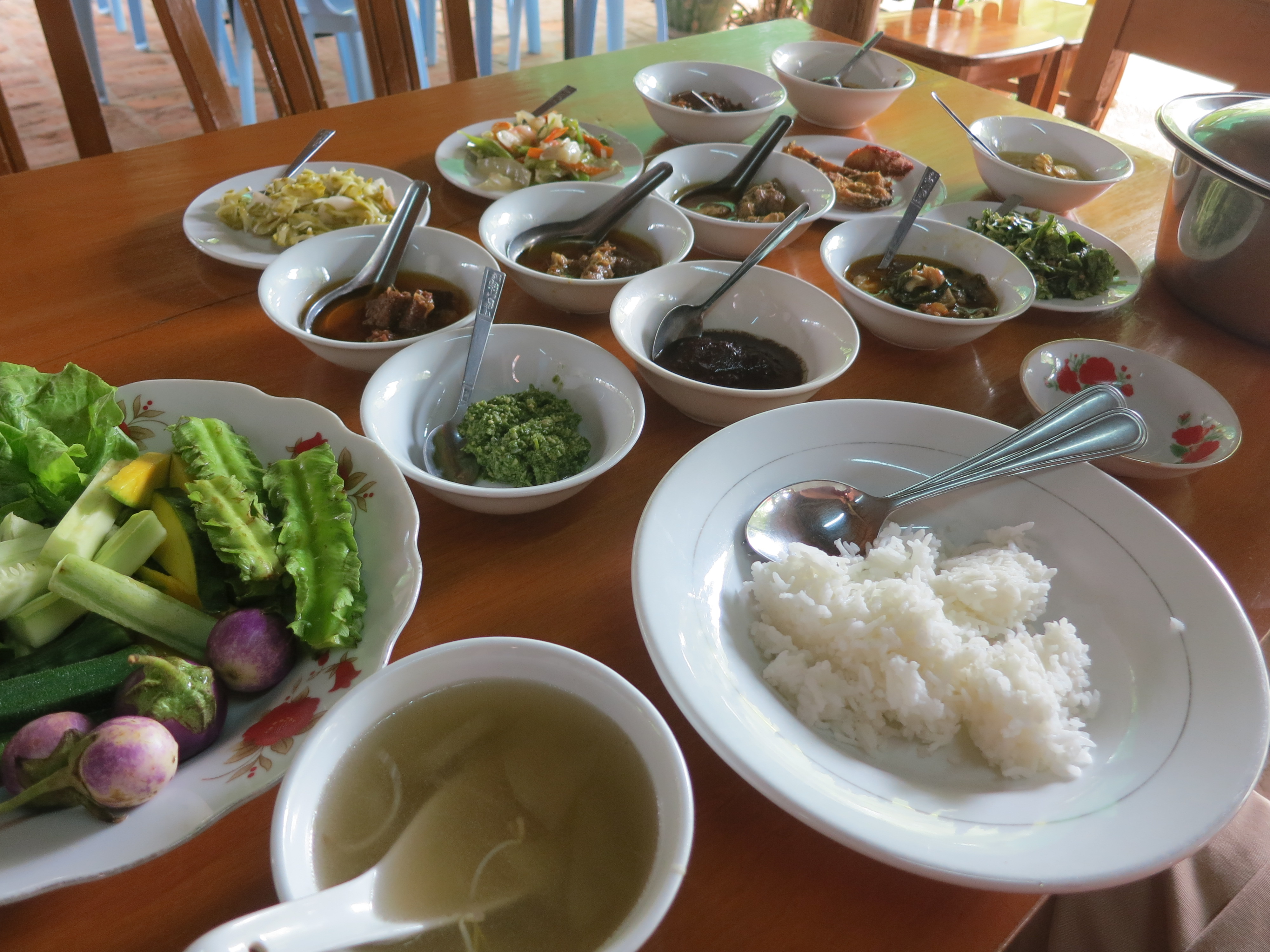 Along with the rice and various salads, curries, noodles, and fried dishes, meals almost always include a plate of raw vegetables and one or more "dips," along with a bowl of soup that rotates from day to day