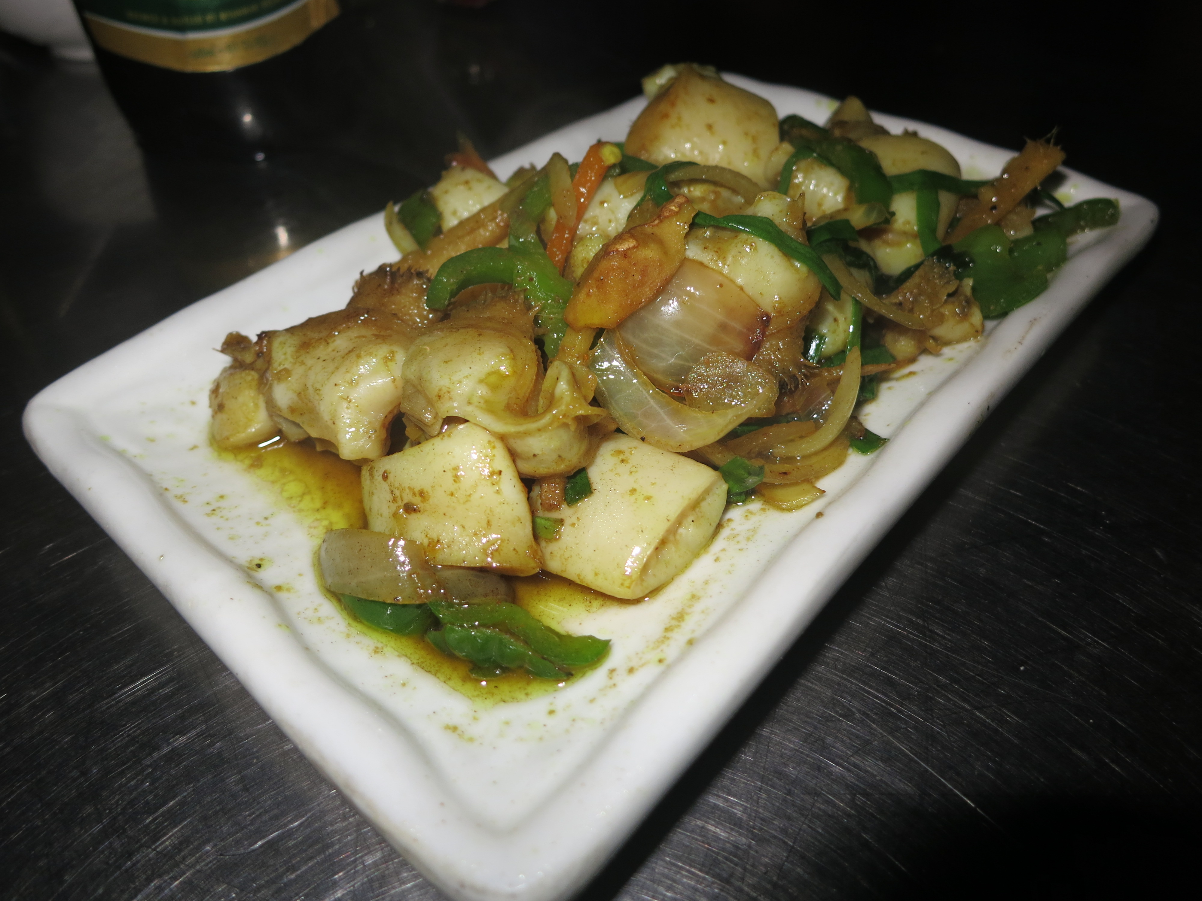 Gone Myow Mah Kyaw -- this is another entry for the "weirdest food I've ever eaten" category.  The white calamari-like rings you see in this stir-fry are actually from a tubular worm that grows inside stalks of bamboo.  Mmmmm....delicious bamboo worm.....(drools)....