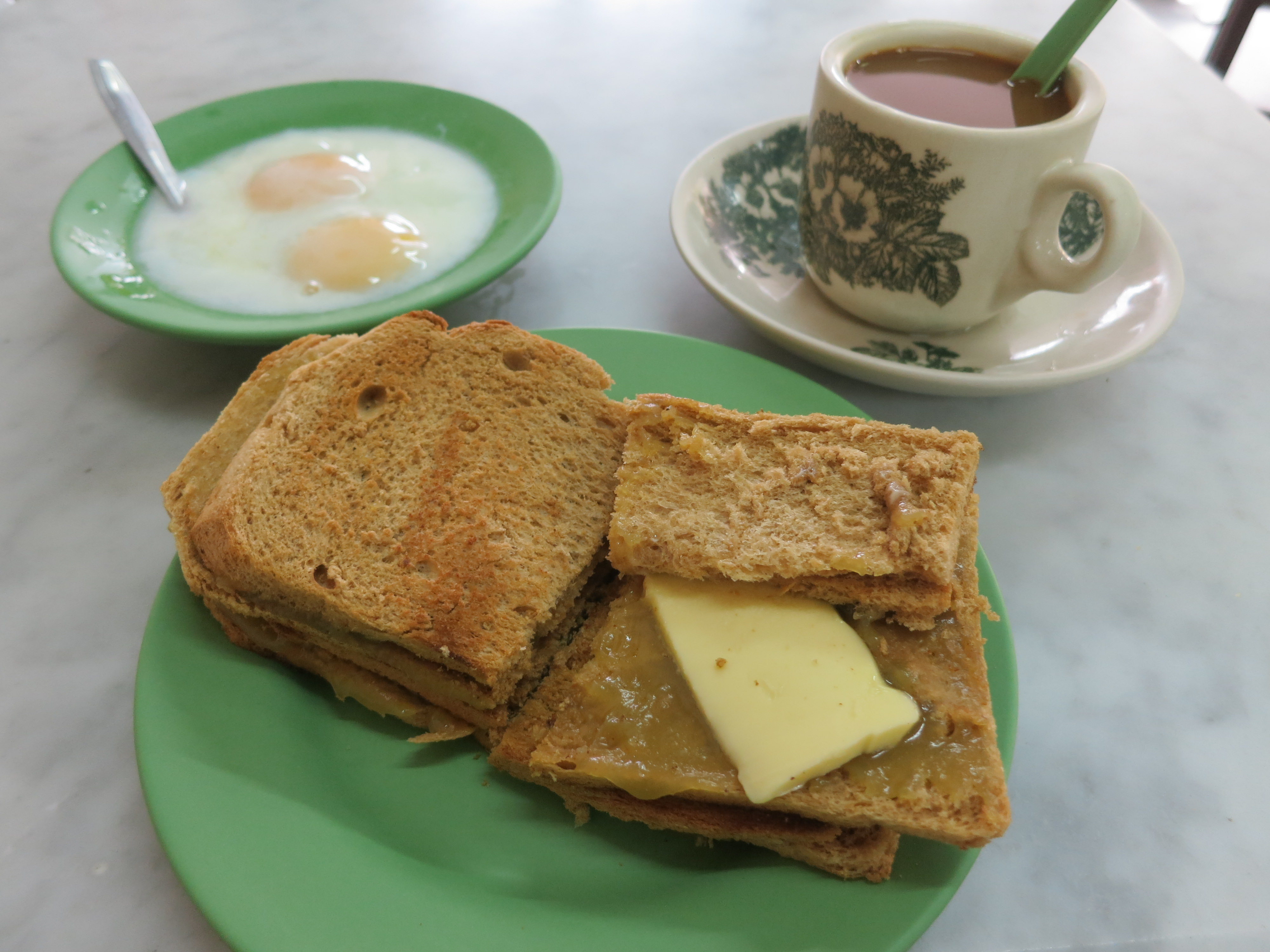 The common morning treat that is Kaya Toast and Coffee (a coconut-and-butter jam served with toast and very runny eggs)