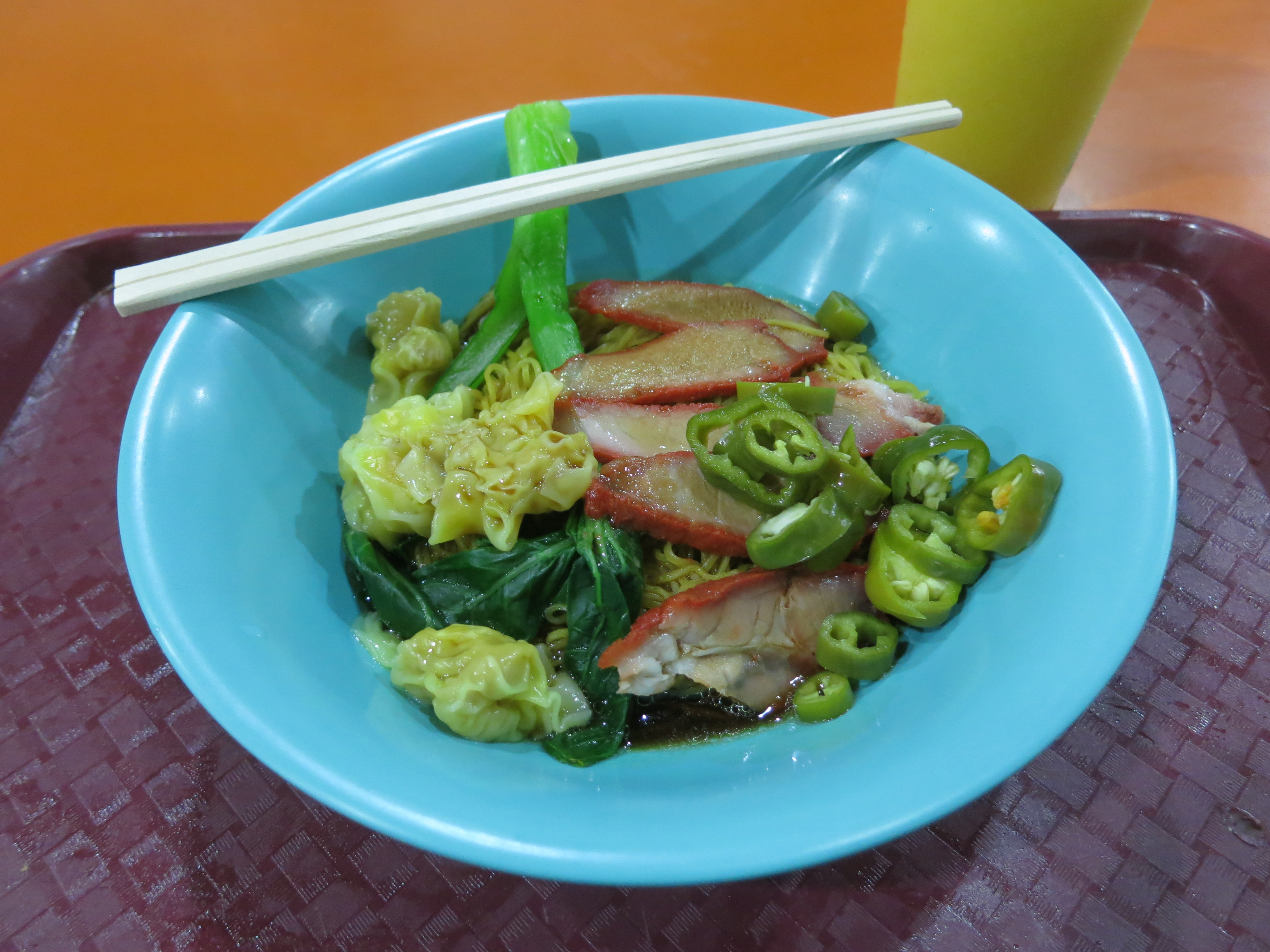 Wanton Mee — a Chinese-influenced dish of roasted pork, small wontons, and a bowl full of egg noodles (I elected to add the large pile of chiles myself